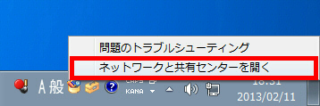Windows の画面の右下にあるネットワークのアイコンを右クリックし、「ネットワークと共有センターを開く」をクリックします。